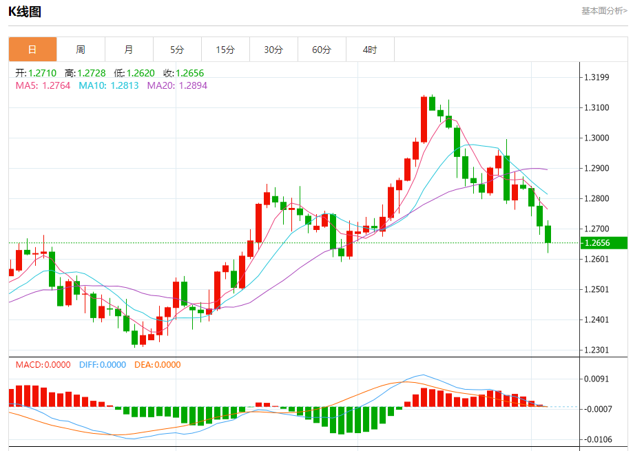 周四欧市盘中,英镑兑美元交投于1.2658,跌幅为0.43%。