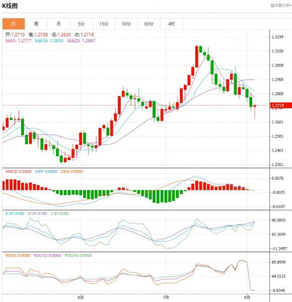汇价高见1.2728,低见1.2620。上一交易日。基本面上看,英镑昨日震荡下行,一度失守1.2700关口并刷新19个交易日低位,现汇价交投于1.2720附近。美元指数在美联储年内加息预期重燃和强劲经济数据的支撑下持续攀升是施压英镑下挫的主要原因。不过,在英国央行本周利率决议公布前,投资者保持警惕,限制了汇价的下跌空间。技术面上看,如果英国央行不加息50个基点,英镑将很脆弱,而英国央行若仅加息25个基点,由于稳健的美国经济数据,可能很容易将英镑兑美元拉回1.25以下。