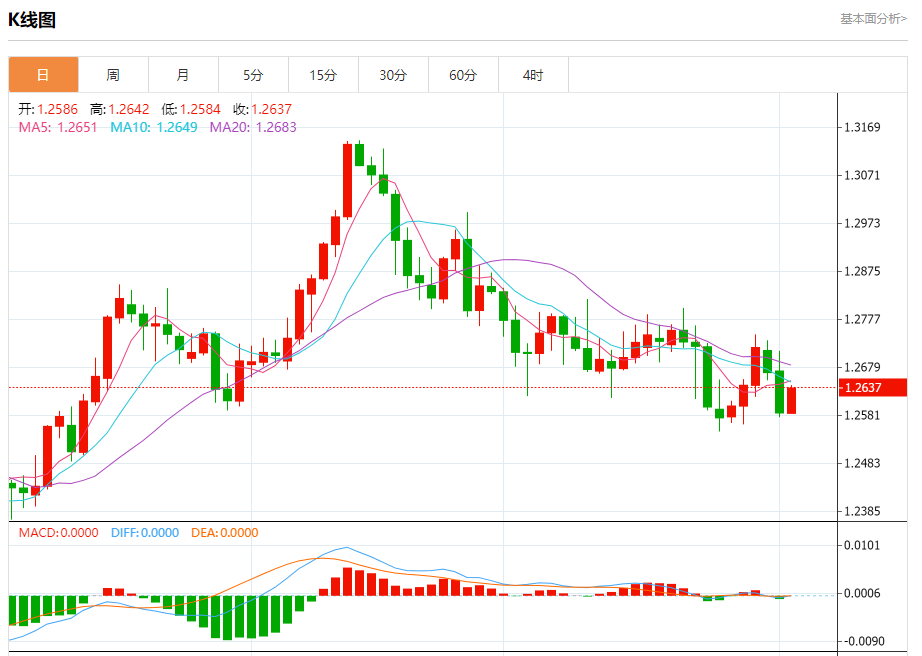 周一欧市盘中,英镑兑美元交投于1.2637,涨幅为0.40%。