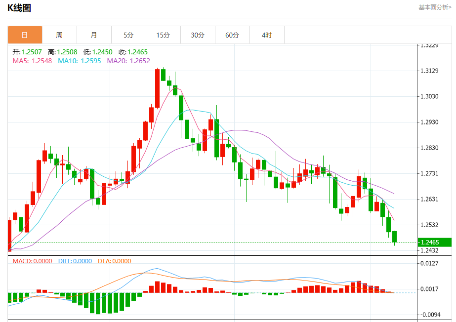 周四欧市盘中,英镑兑美元交投于1.2466,跌幅为0.32%。