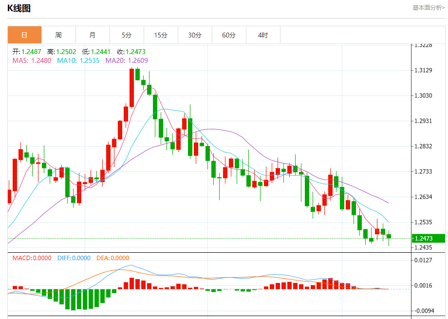 周三欧市盘中,英镑兑美元交投于1.2473,跌幅为0.12%。