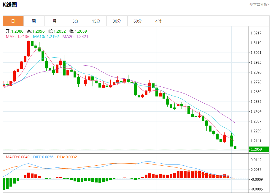 周二欧市盘中,英镑兑美元交投于1.2060,跌幅为0.23%。