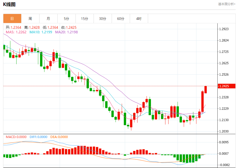 周一欧市盘中,英镑兑美元交投于1.2427,涨幅为0.37%。