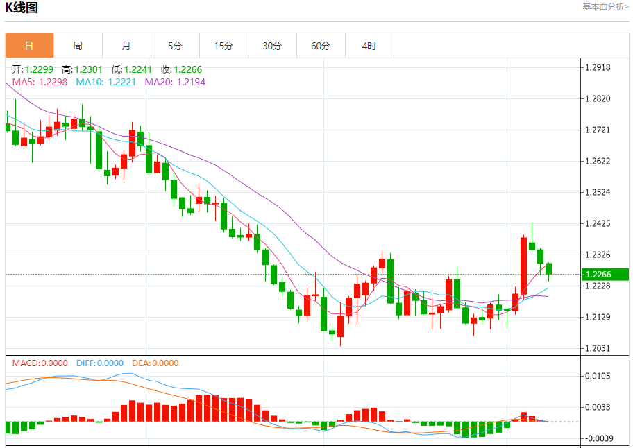 周三欧市盘中,英镑兑美元交投于1.2267,跌幅为0.28%。