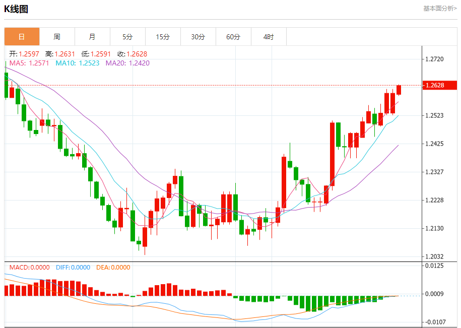 周一欧市盘中,英镑兑美元交投于1.2630,涨幅为0.22%。