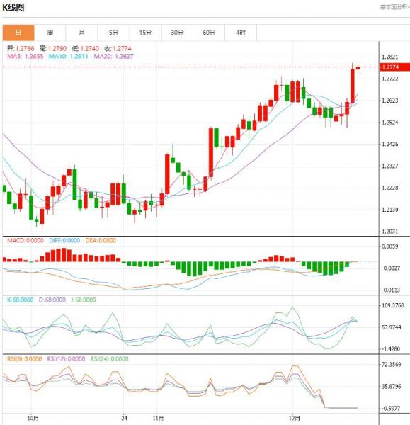 行情分析:汇价高见1.2790,低见1.2740。上一交易日,基本面上看,英镑昨日大幅攀升,冲击1.2800关口并刷新4个月高位。美元指数在鸽派美联储决议影响发酵,美联储降息预期升温的打压下刷新4个月低位是支撑英镑攀升的主要原因。此外,时段内英国央行利率维稳并释放鹰派信号也对汇价构成了一定的支撑。技术面上看,日图以大阳线突破前高1.2732,打开进一步上行空间,但短线偏离均线,不排除修正的可能性。4小时图短期均线上行提供支持,短线关注1.2800阻力。小时图连续拉升后在高位整理,随机指标熊背离。