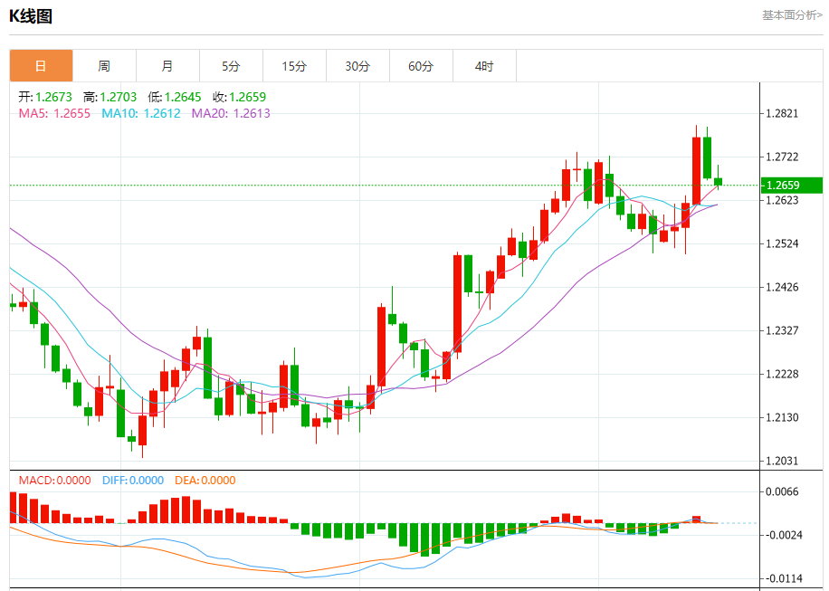 周一欧市盘中,英镑兑美元交投于1.2660,跌幅为0.12%。