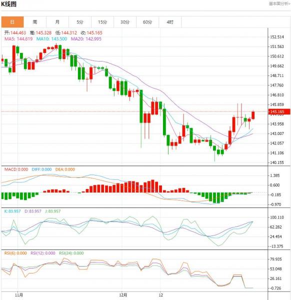 行情分析:汇价高见145.328,低见144.312。上一交易日,基本面上看,今年,美元已从疲态中有所恢复,一些人认为年底前的抛售过度。但对美联储政策的预期可能会继续推动美元走势。周四的12月消费者物价通胀报告将是本周的主要经济数据。预计报告将显示12月总体物价环比上升0.2%,同比上升3.2%。如果数据证实通胀继续放缓,可能会令3月降息的预期升温,但如果数据高于预期,可能会部分逆转上述降息预期。技术面上看,日线图上美元兑日元近期的空头回补上升在146遇阻后,出现小幅度的获利调整。在周四的美国通胀数据公布前,预料美元/日元将继续维持窄幅区间整理走势,波动区间集中在143-145之间。