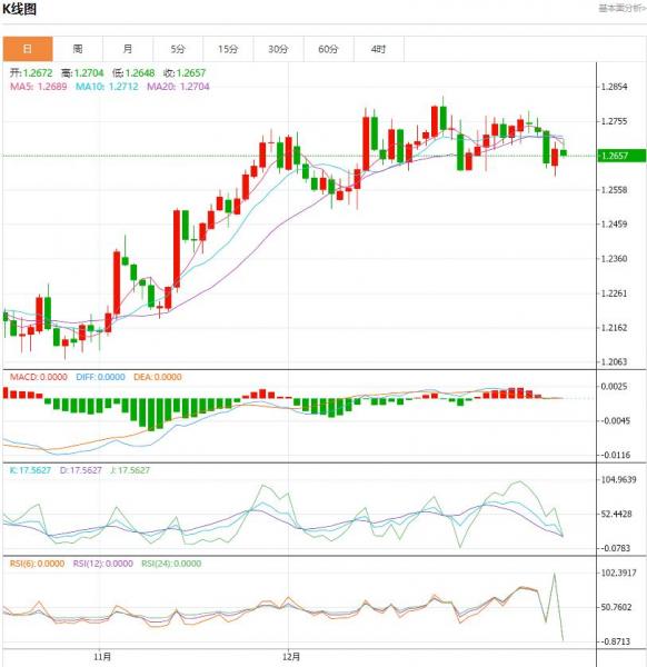 周四盘中,英镑/美元下跌至-0.0018点位,跌幅-0.14%。自12月中旬以来,英镑兑美元似乎进入震荡横盘。横向通道的底部出现在1.2585,上限出现在1.2794,目前的价格走势大致在这两个水平的中间。