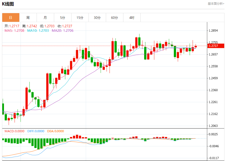 周四欧市盘中,英镑兑美元交投于1.2728,涨幅为0.02%。