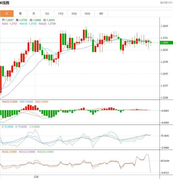 交易策略:可以在1.2730---1.2650的区间上限卖出,有效破位40个点止损,目标在区间的下限。