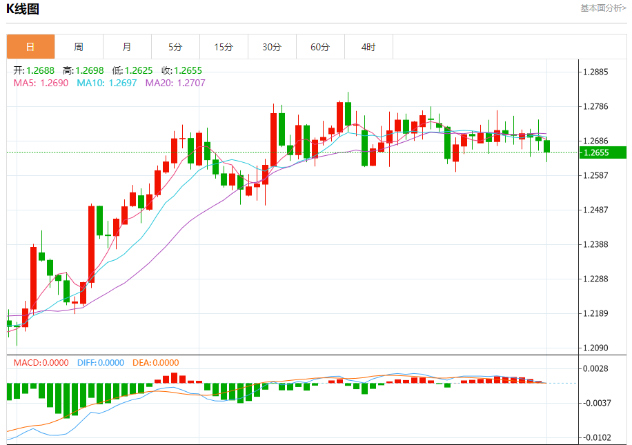 周四欧市盘中,英镑兑美元交投于1.2655,跌幅为0.26%。