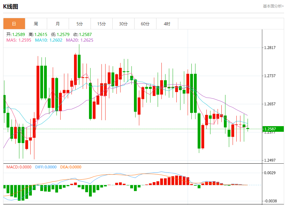 周二欧市盘中,英镑兑美元交投于1.2589,跌幅为0.03%。