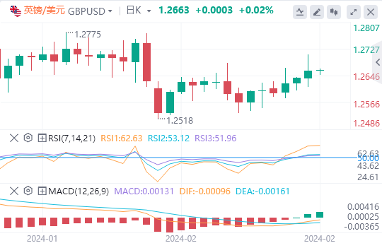 技术面上,汇价上行的初步阻力位于1.2710,进一步阻力位于1.2759,关键阻力位于1.2808;汇价下行的初步支撑位于1.2612,进一步支撑位于1.2563,更关键支撑位于1.2514。