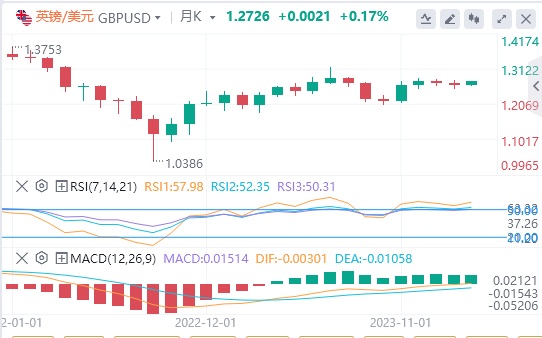 4小时图的相对强弱指数(RSI)攀升至60以上,英镑/美元最后一根4小时阳烛收于1.2700以上。上行阻力位于1.2760(静态水平)、1.2800(静态水平,心理水平)和1.2830(12月28日高点)。
