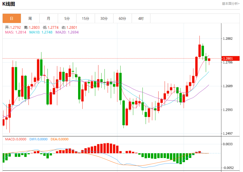 周三欧市盘中,英镑兑美元交投于1.2803,涨幅为0.07%。