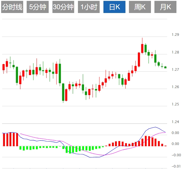 一旦清除,将进一步下行,在100日均线1.2607,然后是200日均线1.2590。另一方面,如果买家将汇率抬高至上周五高点1.2758上方,则进一步上涨至1.2800。