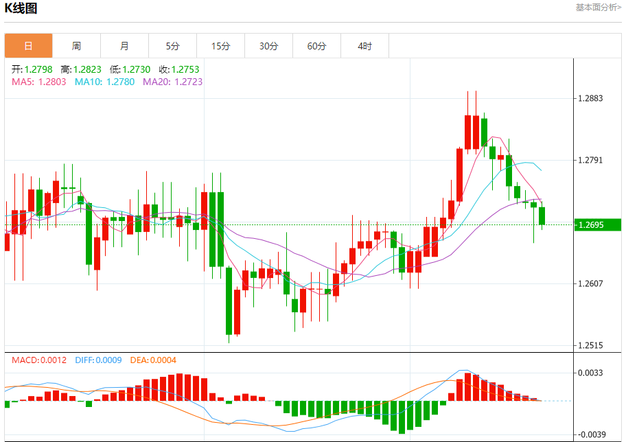 周三欧市盘中,英镑兑美元交投于1.2696,跌幅为0.20%。