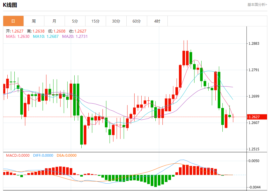 周三欧市盘中,英镑兑美元交投于1.2628,涨幅为0.00%。