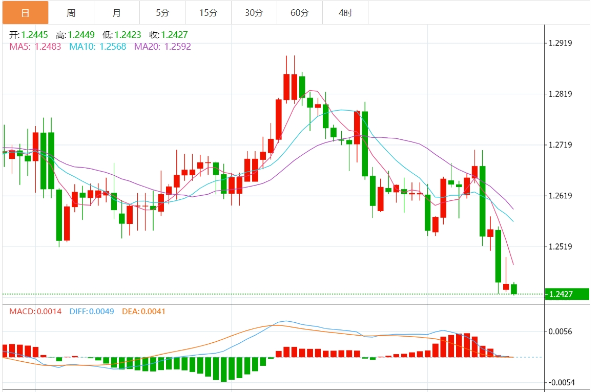 英镑/美元周一小幅下跌,但保持在支撑位1.2435上方。为了提振对英镑的情绪,这个技术底线必须保持完整;如果不能防止击穿,可能会导致回调至1.2325。如果进一步走软,空头可能会有勇气向 2023 年 10 月的低点 1.2040 附近发起攻击。