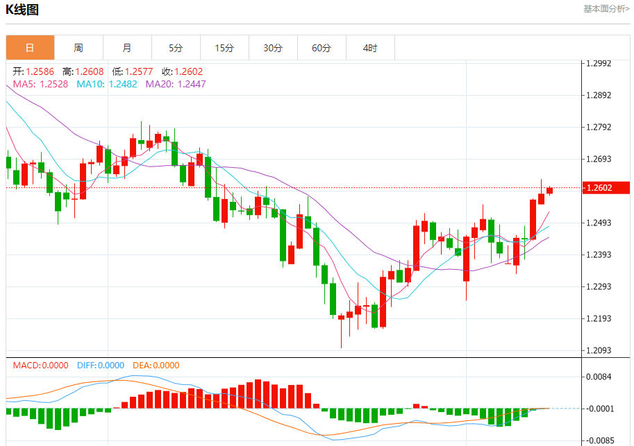 周一欧市盘中,英镑兑美元交投于1.2601,涨幅为0.13%。