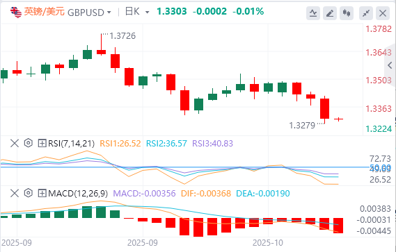 10月10日,周五亚市盘中,英镑/美元徘徊在1.3303附近。
