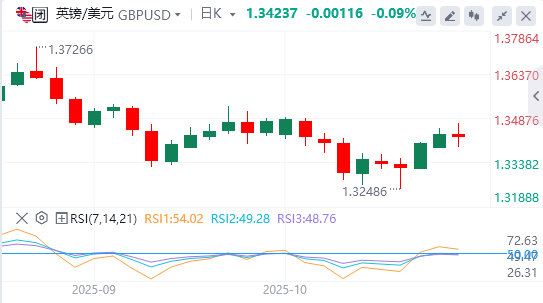 支撑与阻力:英镑/美元已收复21日均线(1.3424),14日RSI突破50至52附近,显示短期上行动能增强。关键阻力位在1.3500心理关口,突破后可能挑战1.3600(供应区及趋势线阻力)、7月高点1.3681及9月高点1.3763。