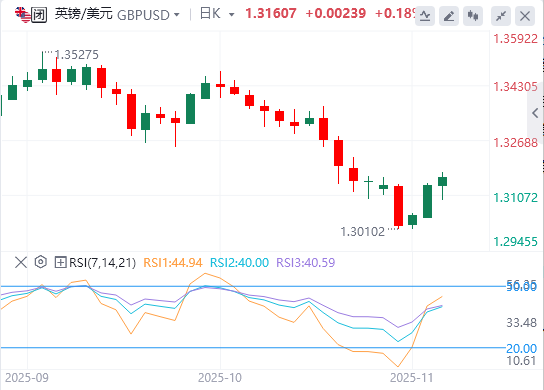 此外,美元也因市场对美联储12月再次降息预期的降低而获得新支撑。美国私营部门就业和服务活动数据表现强劲,使得市场对12月降息的押注大幅减少。ADP公布的数据显示,10月美国私营部门就业人数增加42,000人,超出市场预期的25,000人;ISM服务业PMI上月意外升至52.4,主要得益于新订单大幅增长。美元的广泛走强,将英镑/美元压至1.3000心理关口,不过本周后期英镑出现了较为可观的反弹。