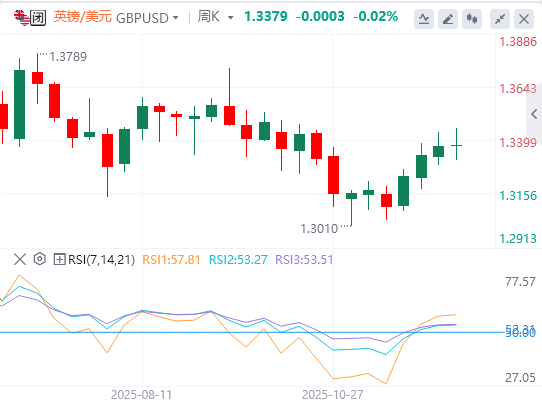 支撑方面,1.3100上升趋势线为关键防线,跌破则可能下探1.3030-1.2960区域(21月与100月均线交汇处),进一步支撑位于50月均线1.2721。若跌破1.2500心理关口,或重演2025年1月低点1.2100。