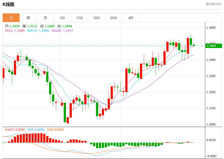 周三欧市盘中,英镑兑美元交投于1.3496,跌幅为0.04%。