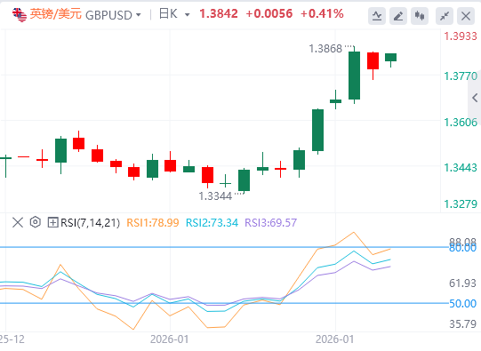 当前阻力位在1.3869,为2021年9月以来最高,紧接着是上升楔形的上界,约1.3910。持续突破可能开启新一波上涨,目标为1.4248,为2018年4月以来最高点。