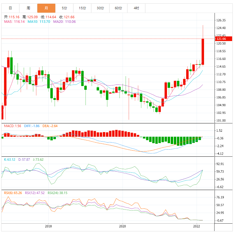 3月美元兑日元行情,美元兑日元从3月初的开盘价114.94至目前的121.73,美元兑日元3月整体下跌679点,其中在3月28日曾涨至最高点125.09。