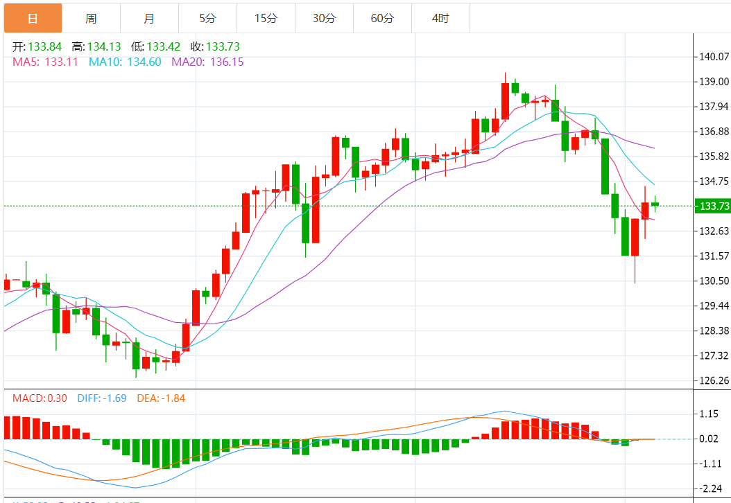 4小时图V型反转,多头仍占主导。小时图反复测试130.40一线企稳回升,仍有望进一步扩在该水平之上得以整固,但上方135.00水平处会构成阶段的初步阻力。