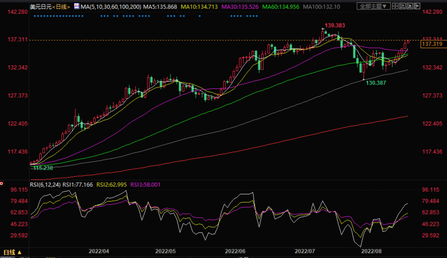 从一周前开始,美元/日元上涨了350 多点。美元/日元上周收盘于136.976。美元/日元维持看涨的长期趋势保持不变。下一个阻力位在137.80,然后是138.80,然后是数年高点139.40,然后指向140.00水平。