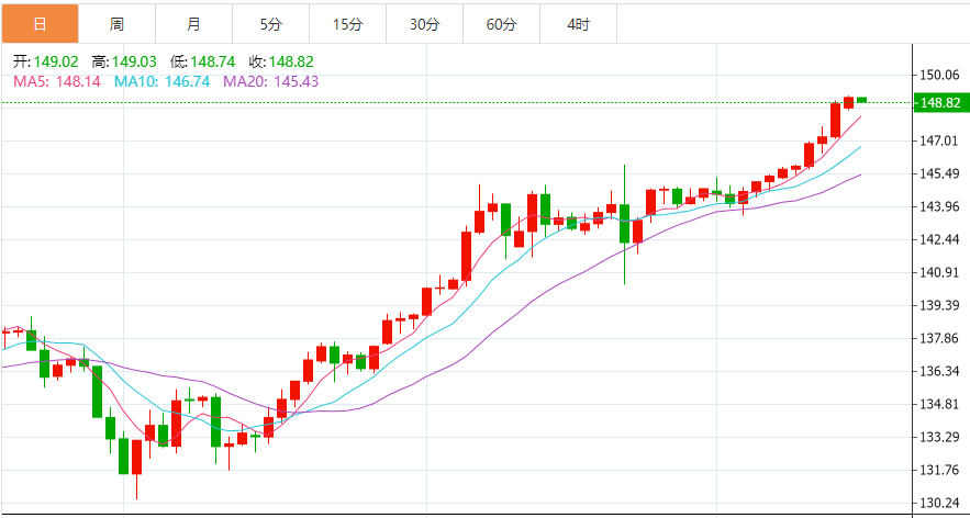 技术上,美元/日元在冲破1998年8月的高点(147.67)后,继续创下年度新高,汇率九天上涨,推动相对强度指数(RSI)超过70。