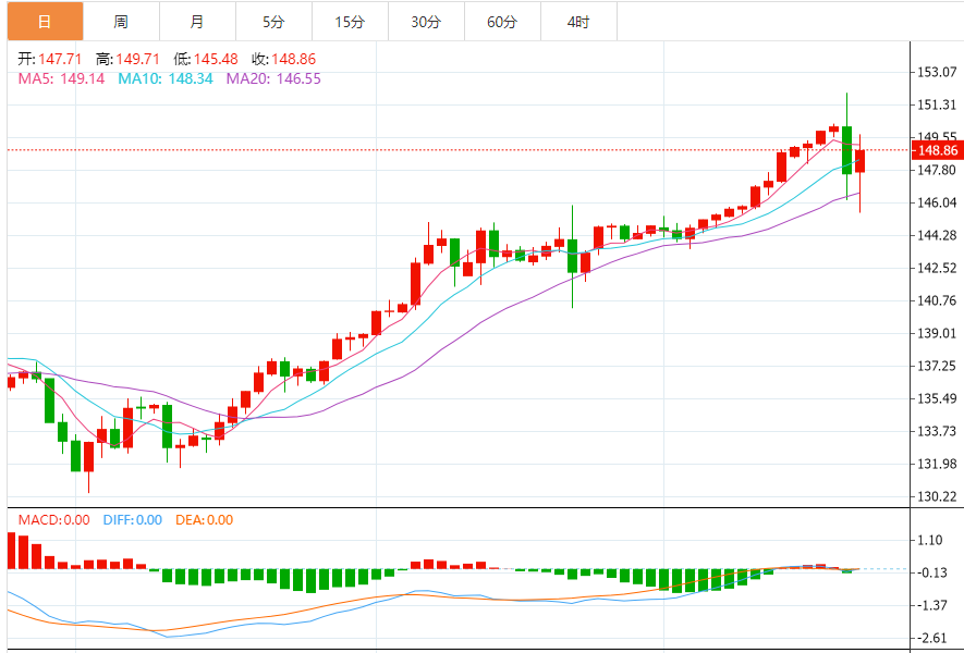 看涨势头似乎完好无损,价格交易高于所有时段的简单移动平均线(SMA),所有这些SMA都具有正梯度。看涨势头减弱的短期潜在指标可能会低于10天SMA,目前为146.21。