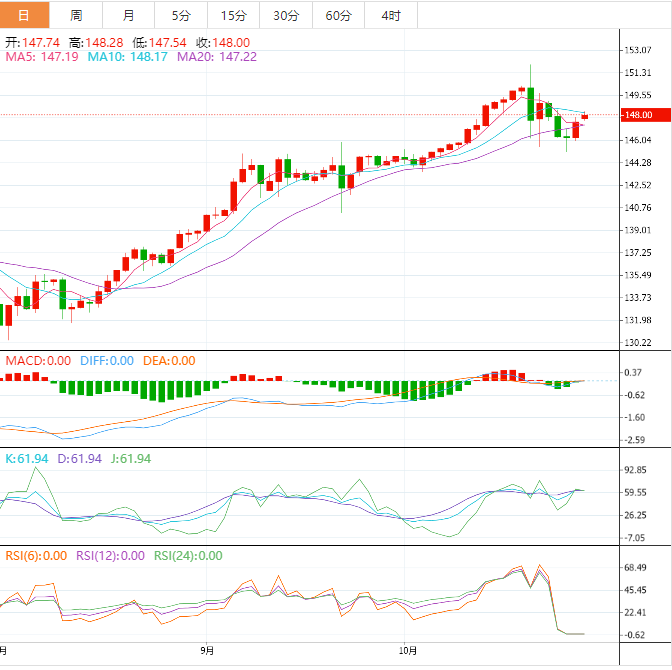 基本面上,受美元指数波动影响,美元/日元已跌至支撑147.82。美元指数已刷新日内低点110.72,市场风险偏好强劲回升,美元指数预计将进一步走软。日本零售销售积极也提振日元。日本零售销售月率和年率分别加速至1.1%和4.5%,而期值分别为0.6%和4.1%。日本9月大型零售企业销售额年率飙升至4.1%,高于期值3.6%。此外,日本工业生产年率攀升至9.8%,高于此前预期的8.7%。