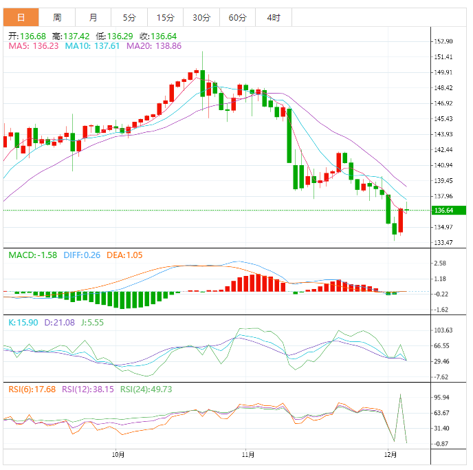 因此,建议今天偏向看涨,注意到突破136.50并再次守在其下方将迫使价格恢复看跌趋势,其下一个主要目标位位于132.75。