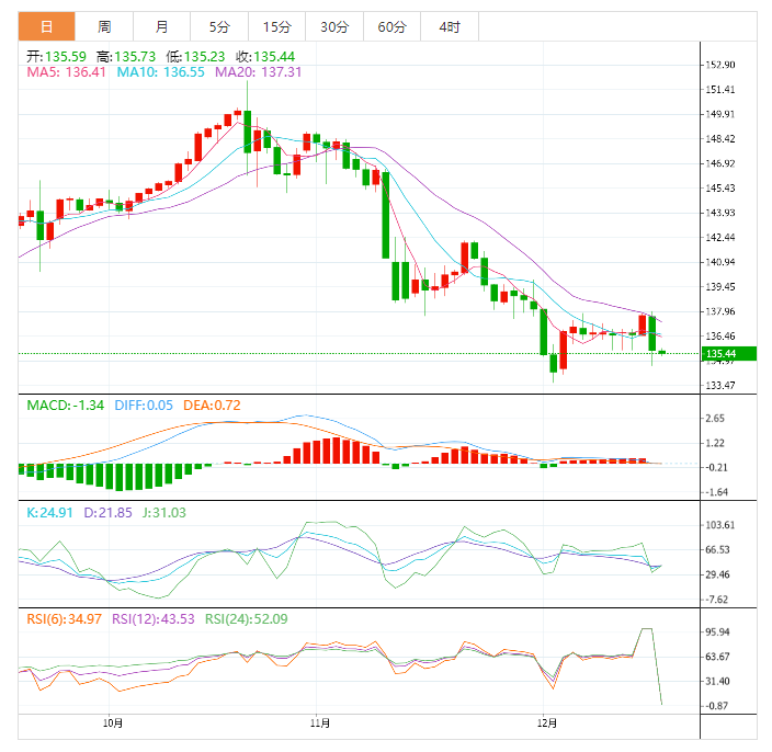 移动至EMA50下方支持了建议的负面情景,除非突破136.50并保持在该水平上方,否则该情景将继续有效。