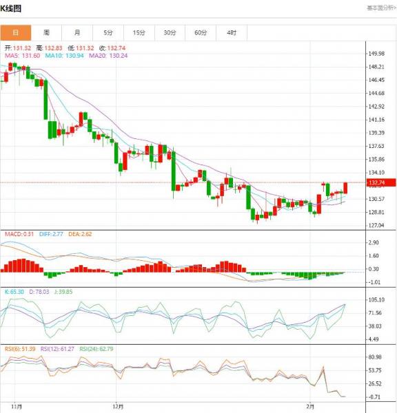 行情分析:汇价高见132.83,低见131.32。上一交易日,汇价收于131.38。基本面上看,上周美元延续非农后的强势跳空高开后,整体维持强势基调,因市场对美联储利率终端预期抬升,上周五数据又显示美国通胀有再度抬头的迹象,进一步刺激市场神经,美元维持在反弹高位收涨。日元多空拉锯,因日央行候选掌门人未定引发不确定性。商品货币整理偏弱。技术上,小时图先抑后扬,再次验证了MA200一线支持。4小时图反复测试MA200获得支持,但缺乏上行动能。日图多空拉锯,短线反弹势头仍维持完好,但动能不强。