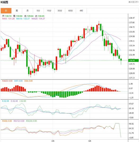 交易策略:日内建议逢高卖出,在130.60附近卖出,回升至130.90加仓,止损设于131.20。
