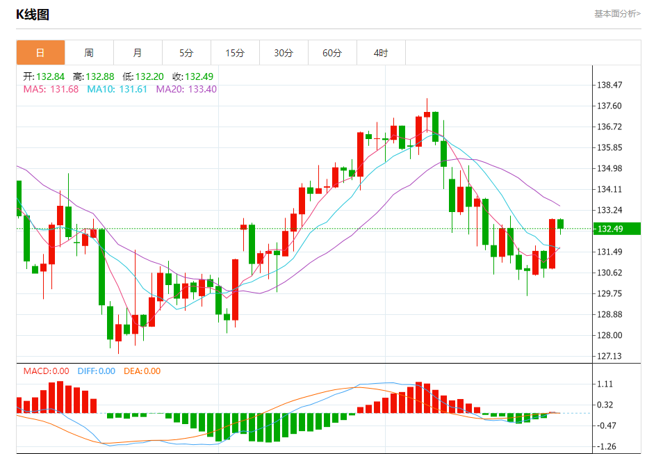 今日周四,截止目前美元兑日元报132.50,下跌0.28%。
