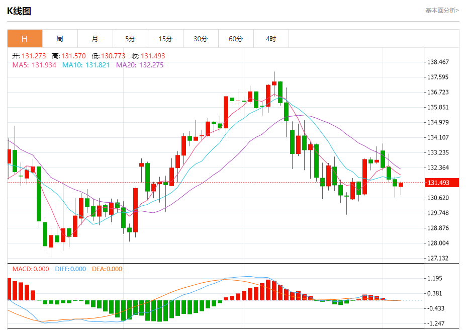 今日周四,截止目前美元兑日元报131.538,上涨0.17%。
