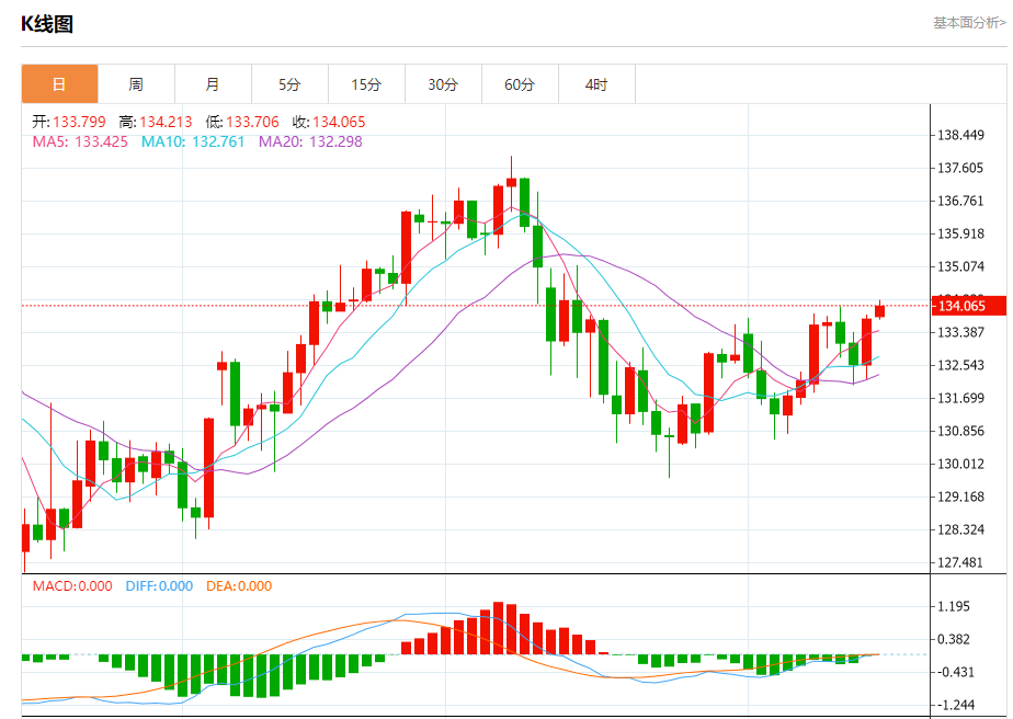 今天的预期交易区间在133.20支撑和134.80阻力之间
