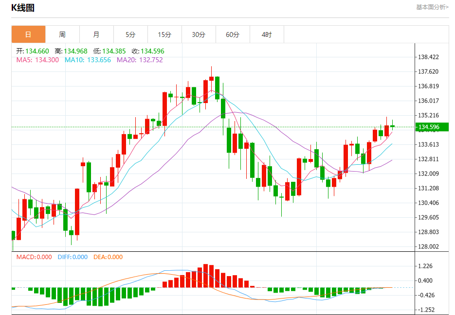 今日周四,截止目前美元兑日元报134.613,下跌0.04%。
