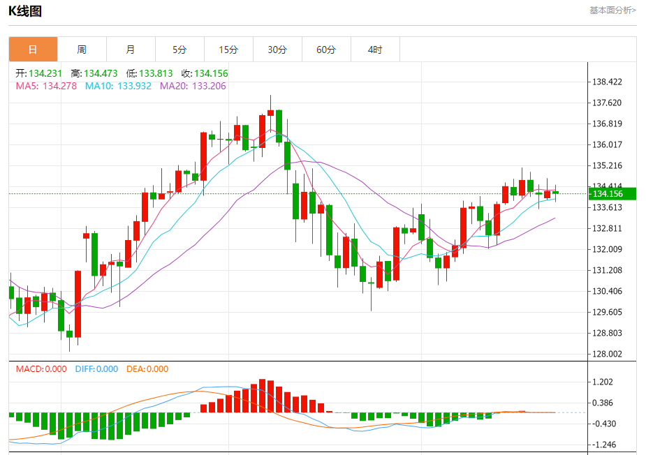 今天的预期交易区间在133.70支撑和135.30阻力之间