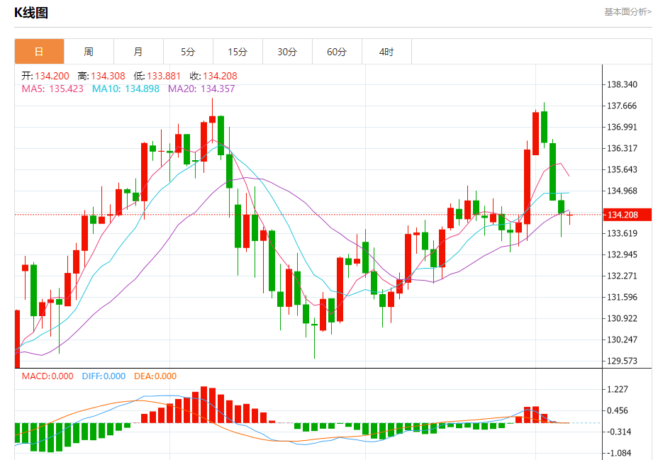 今天的预期交易区间在133.10支撑和134.80阻力之间