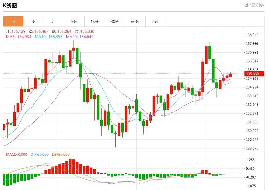 周三纽盘,日元兑美元交投于135.339,涨幅为0.10%。