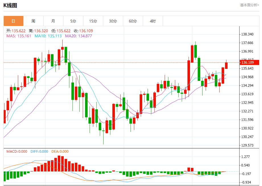 今日周一,截止目前美元兑日元报136.120,上涨0.29%。