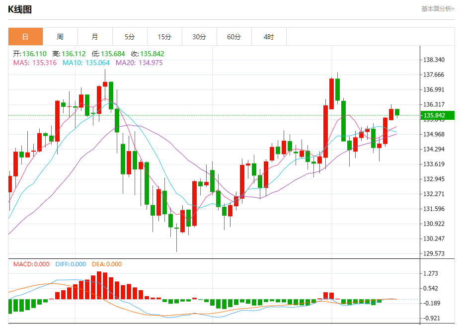 今日周二,截止目前美元兑日元报135.852,下跌0.20%。